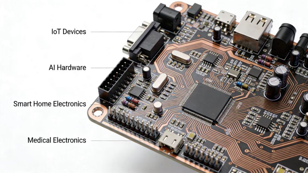 Custom boards can integrate sensors, wireless modules, AI chips, and microcontrollers.