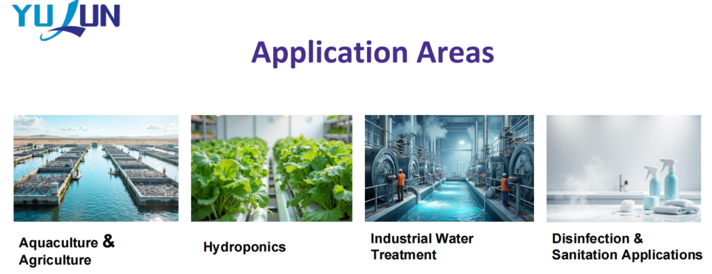 Major industries include aquaculture, agriculture, wastewater treatment, food processing, mining, and environmental remediation.